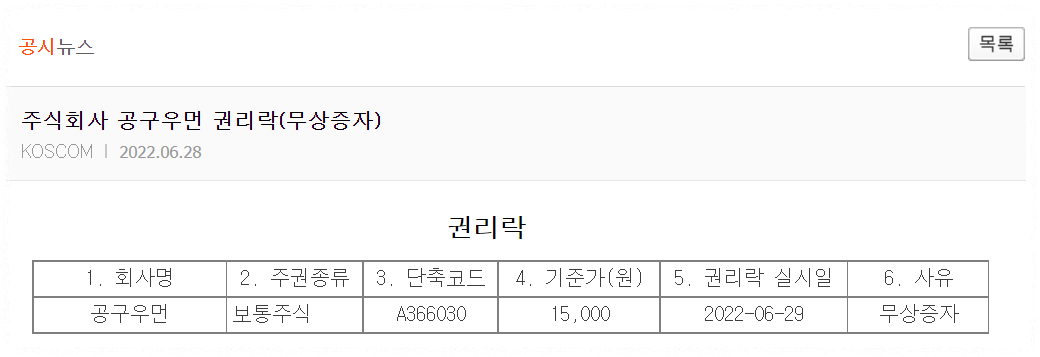 공구우먼의 무상증자 권리락 안내이다.